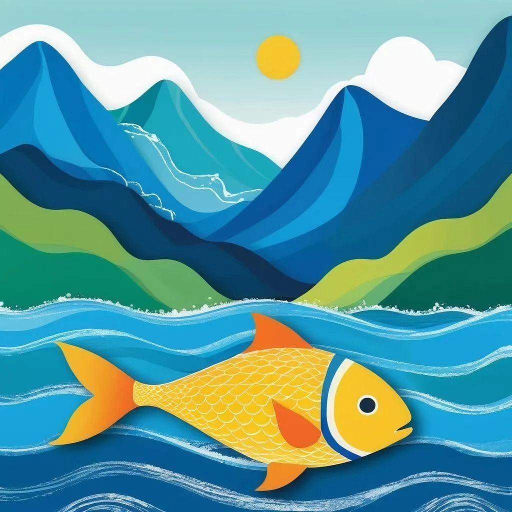 这幅作品中,主要元素包括色彩鲜艳的鱼、波光粼粼的水面以及背景中连绵起伏的群山。颜色上,鱼的黄色和橙色与背景的蓝绿色形成鲜明对比,增强了画面的视觉冲击力。构图上,鱼被置于画面的中央,下方的水波形成了动感的线条。情感表达上,作品传达了一种轻松而活泼的自然气息,或许是对自然和谐的赞美。