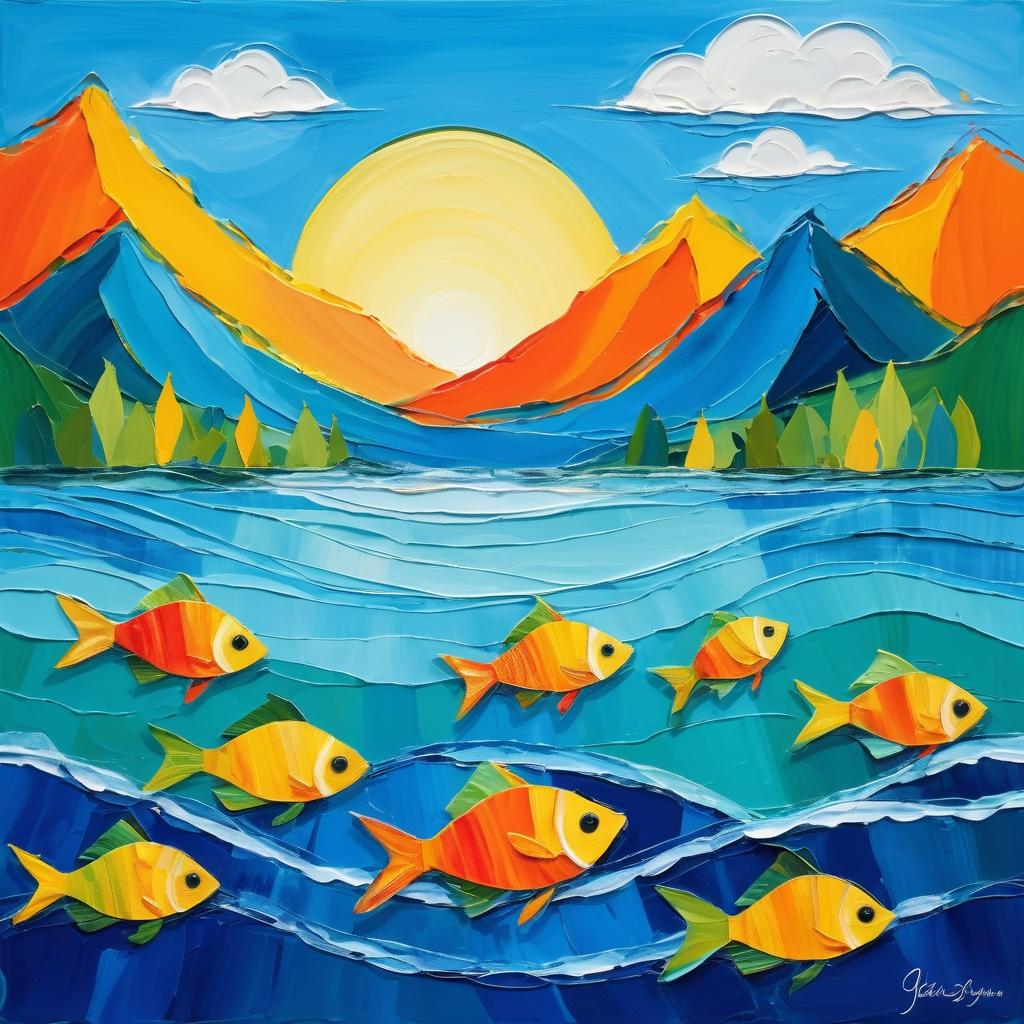 这幅作品以其鲜艳夺目的色彩和生动的构图吸引着观者的目光。画中的鱼以明亮的黄色和橙色呈现,与背景的蓝绿色群山形成了鲜明的对比,仿佛在水中自由游动。水面的波纹线条增加了画面的动感,仿佛能听见水声潺潺。背景中的山脉以抽象的形式展现,增添了作品的艺术性。这幅作品不仅仅是对自然景观的描绘,更是一种对大自然和谐之美的赞美。通过增加自然元素如水中小动物或天空中的飞鸟,作品可以进一步丰富其内容,激发观者的想象力。使用不同的画材,如拼贴或混合材料,可以赋予作品更多的质感和层次感,使其在儿童艺术领域中更具吸引力。这种创作方式不仅增强了作品的视觉吸引力,还让孩子们在欣赏作品的过程中感受到自然之乐。