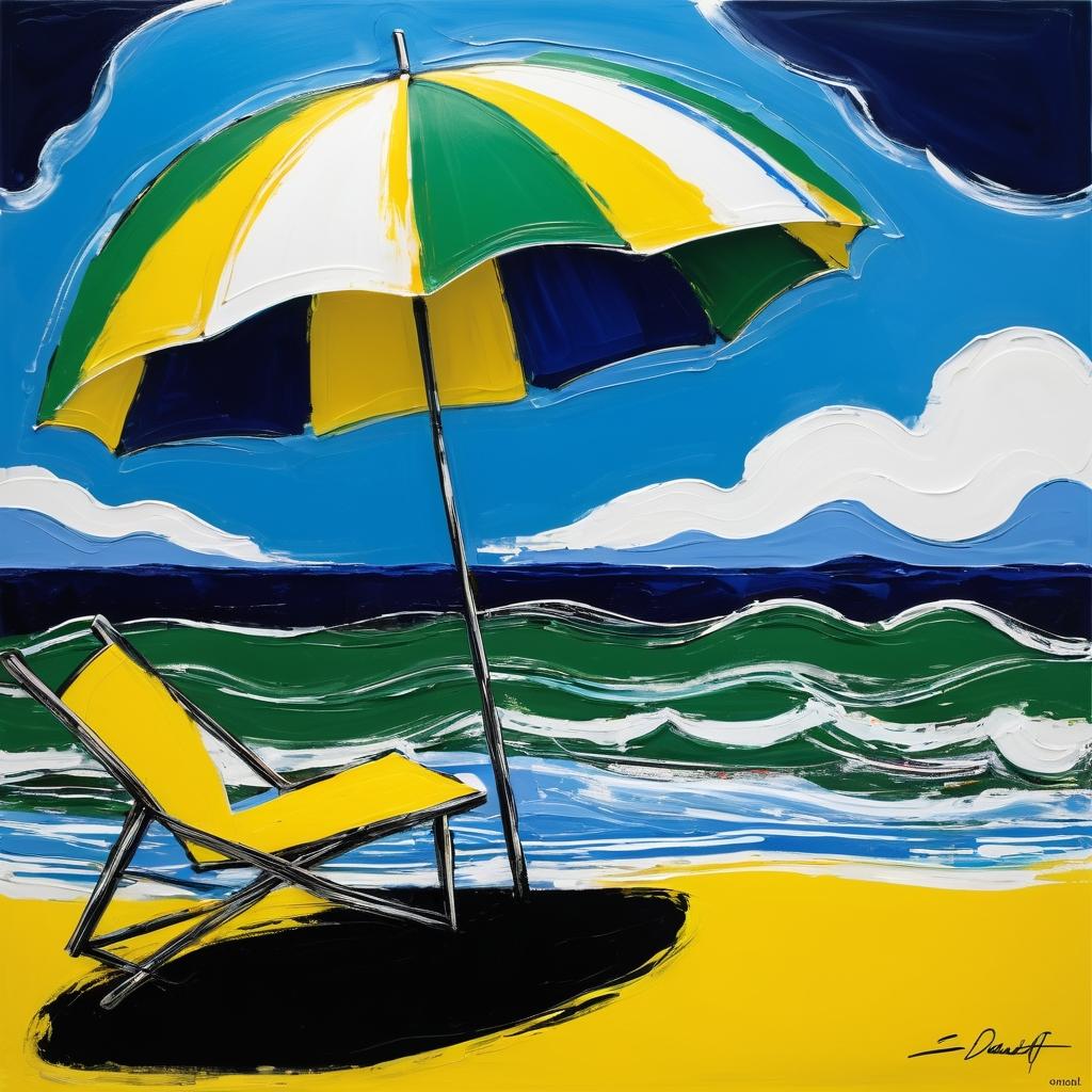 这幅作品以其简洁而富有想象力的线条吸引眼球,仿佛是在表达一个孩童心中的夏日海滩场景。为了提升作品的深度,可以考虑在背景中添加一些抽象的波浪或云朵元素,以丰富画面的层次感。同时,可以通过调整色彩的明暗对比,增强画面的立体感和视觉冲击力。此外,在构图中引入更多动态元素,例如海鸟或海浪的形状,能使画面更具生命力。整体上,这幅作品可以通过细节的增强,使其充满更多的故事性和幻想色彩。与让·杜布菲 (Jean Dubuffet) 的风格结合,可能会带来一种原始艺术的震撼效果。