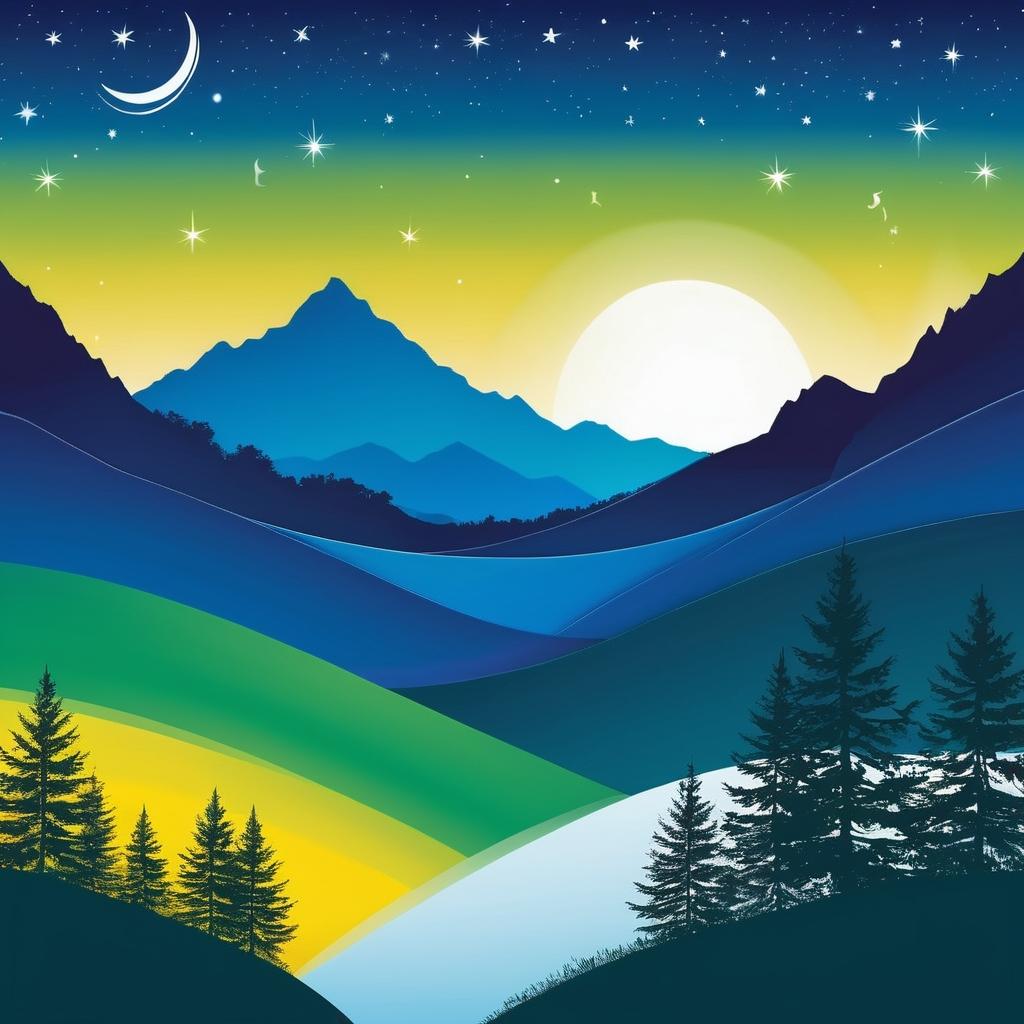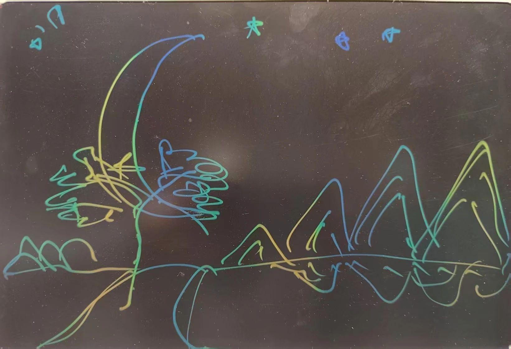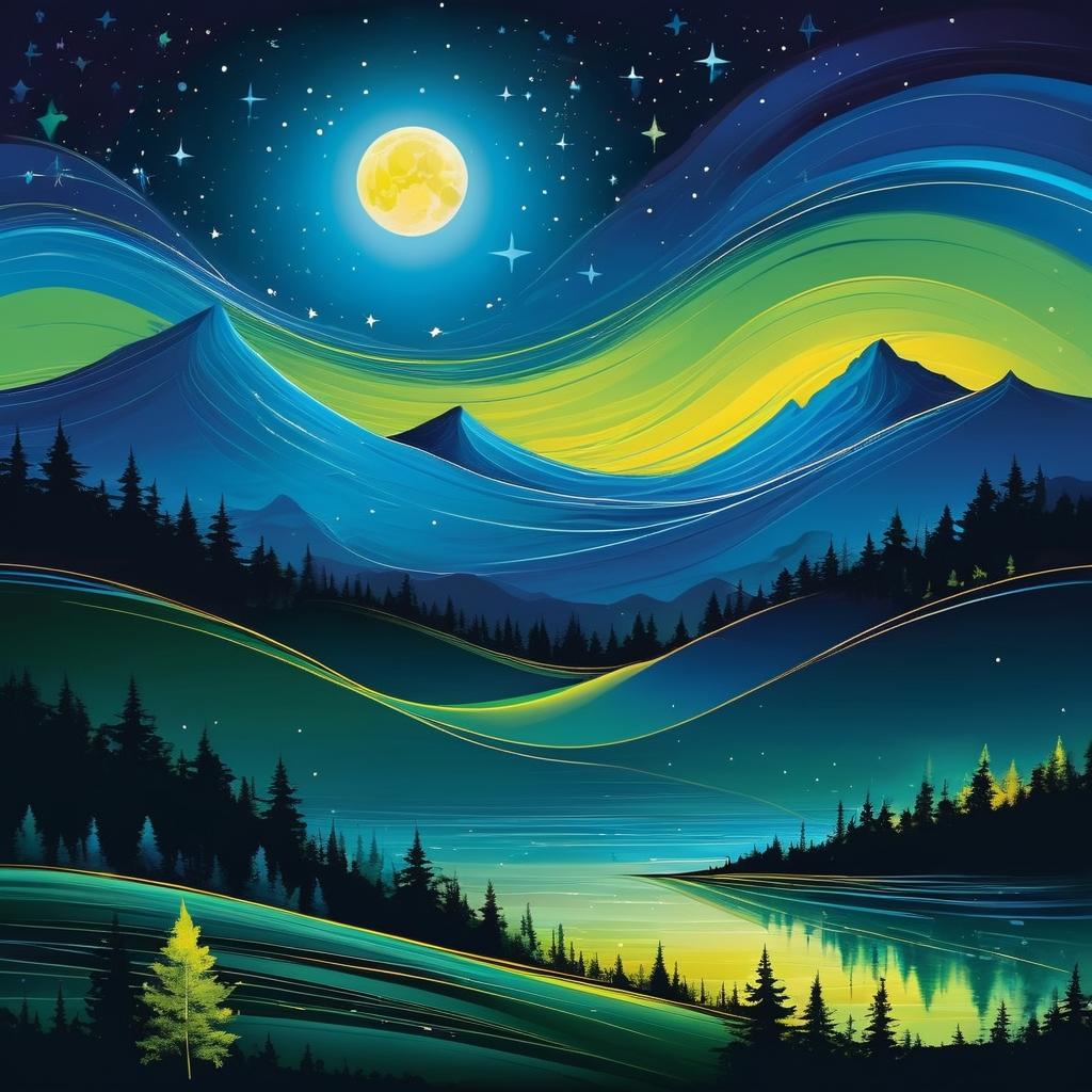 这幅画充满了色彩和抽象的线条,主要元素包括一轮弯月、几颗星星以及可能代表树木和山脉的线条。颜色主要是蓝色、绿色和黄色,呈现出一种夜空的景象。整个构图流畅而富有动感,给人一种幻想和宁静的感觉。创作者可能想表达一种自然和谐的状态或是夜晚的宁静之美。