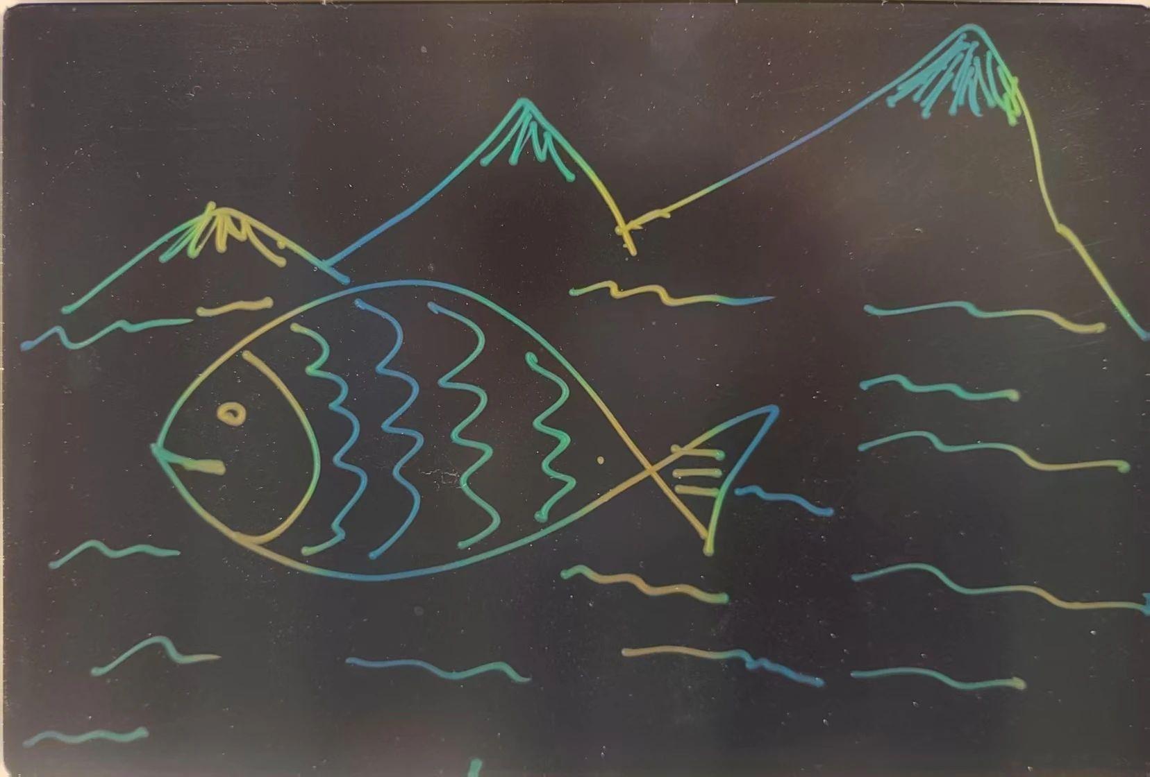 这幅作品呈现了一条鱼在水中游动的场景,背景是山峰和水波的简单线条构成。色彩使用了鲜明的蓝色、绿色和黄色,使得画面充满活力。整体构图简单而富有童趣,可能在传达一种对自然和生命的轻松、愉悦之感。