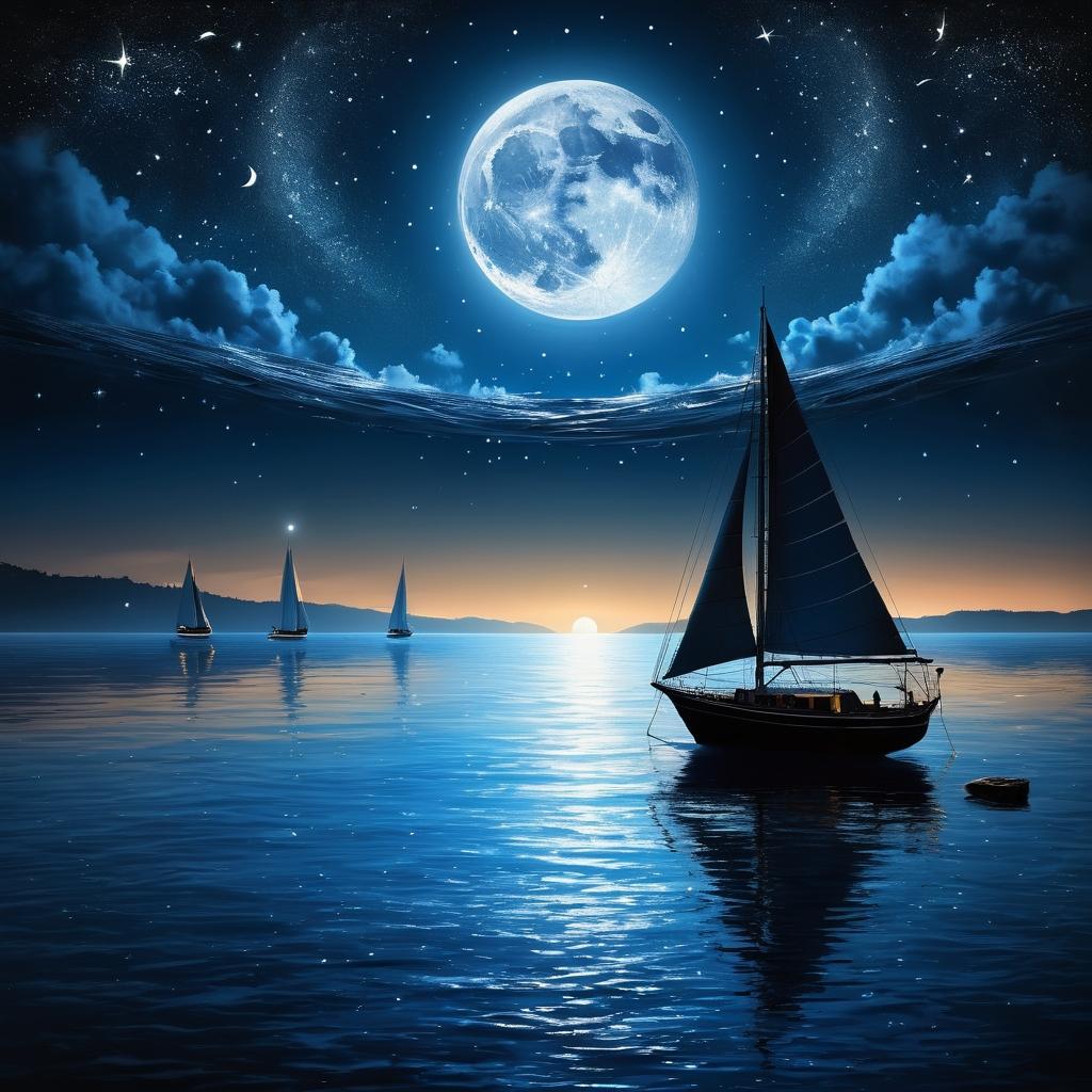 这幅画作以其宁静的夜色和流畅的线条展现了一种梦幻般的浪漫。你可以考虑增加更多的细节,如在海面上加入微弱的星光闪烁,或者在远处的地平线上添加微微的灯塔光芒,以增加画面的深度和神秘感。增强月亮的光辉,使其更具立体感和层次感,同时在小船上添加一些细微的细节,如船帆上的纹理或人物的剪影。这将使作品在视觉上更具吸引力和情感共鸣。